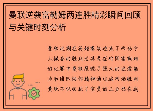 曼联逆袭富勒姆两连胜精彩瞬间回顾与关键时刻分析